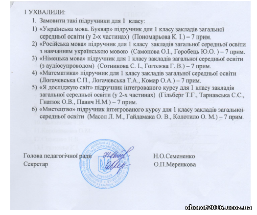 Замовлення підручників для 1 класу (протокол педради)